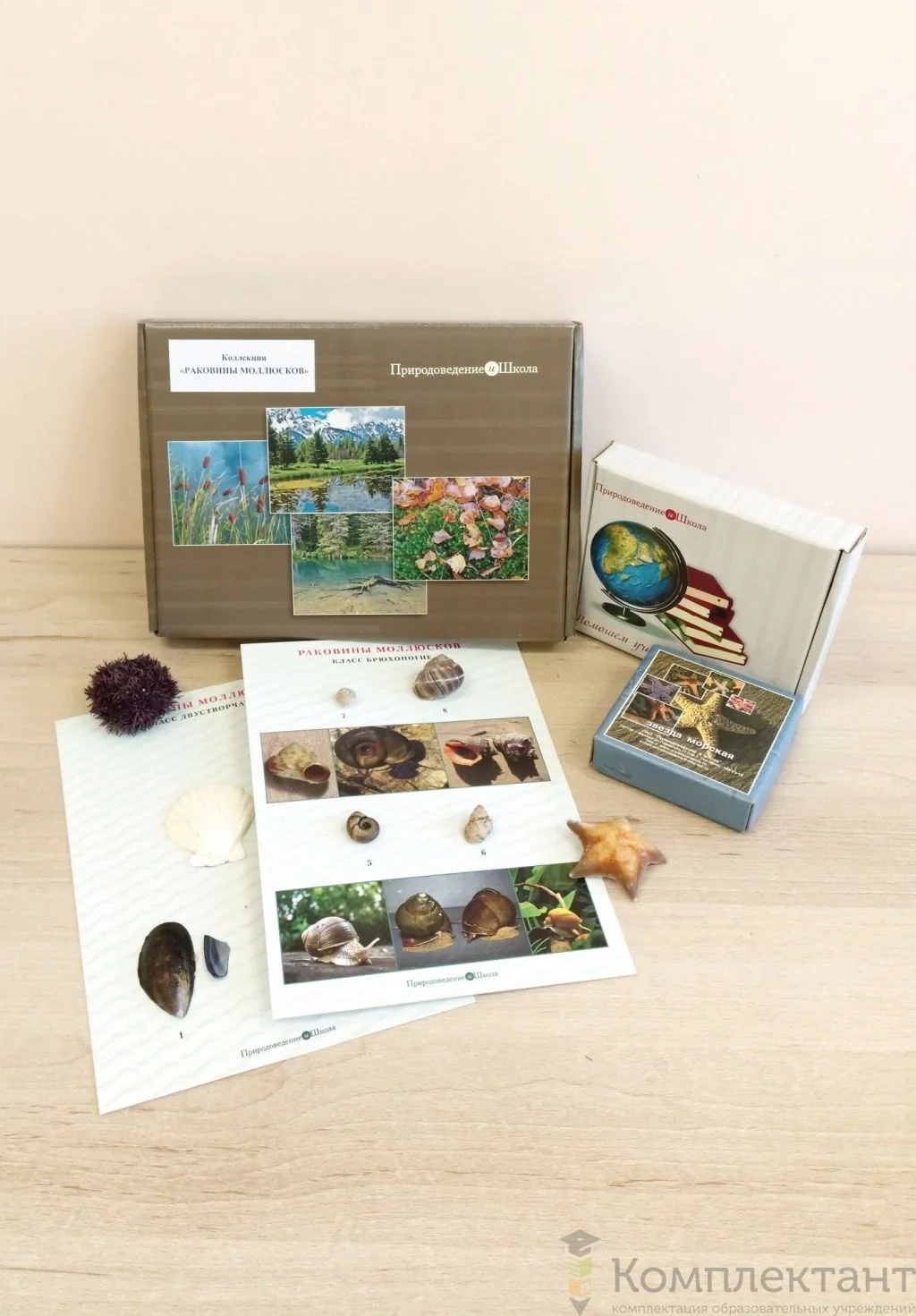 3) Коллекция «Раковины моллюсков». Коллекция содержит 8 образцов раковин моллюсков. Образцы наклеены на 2 цветных заламинированных планшета формата А4. Первый планшет с представителями класса брюхоногие, второй планшет с представителями класса двустворчатые.